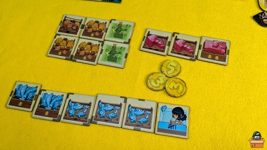 - Baraja las 10 fichas de inicio boca abajo y reparte 2 a cada jugador sin mostrarlas. Luego, coloca 4 fichas más en las casillas centrales del mercado.